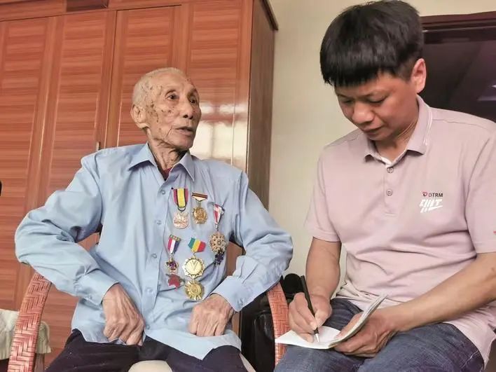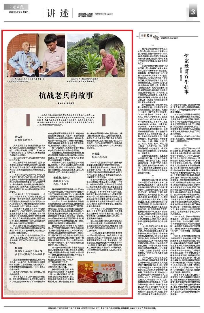 2020年7月,95岁的抗战老兵唐国章(左)在大田县的家中接受采访。 已经95岁高龄的老人讲述:上级分配给大田县知识青年从军入伍指标一个中队,细分为3个分队,大田初中占了一个分队,其余的是集美职校师生。唐国章在县立初中核准入伍后,到永安集合,然后经南平,到江西广丰的“青年军集训总队”驻地,路上担任第3分队代理分队长。 1945年8月15日,夜里部队吹哨紧急集合,上级宣布日本无条件投降,还没来得及上战场的官兵们非常激动,敲打脸盆、往空中扔帽子、互相拥抱、组织火把游行,一直到天亮都不睡觉。 部队在江西黎川驻训,原本准备奔赴抗日前线的青年军,开拔福州准备收台湾。上级要求官兵学讲闽南话,唐国章当了教员。后来,部队接到命令改变任务,北上浙江接受检阅。 1946年,唐国章任青年军陆军31军208师622团步兵一连二等兵。同年5月,他在湖州经过为期3个月的培训,领取了少尉军衔预备军官证书。6月,青年军解散,人员去留自选,唐国章到嘉兴中学读高中……1949年12月,唐国章加入中国人民解放军第二野战军第四兵团14军40师教导队,1955年复员回乡。2022年3月,老人去世,享年97岁。 文章发表于 2025年7月12日 《三明日报》第三版 ↓↓↓