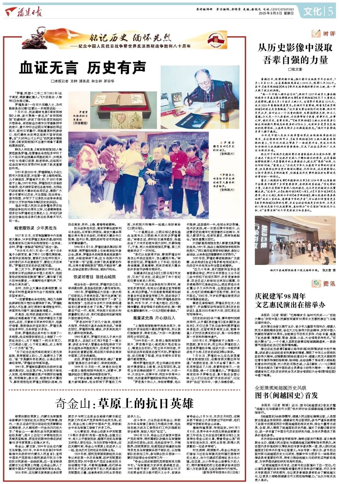 罗瑾在大田县给中学生讲述南京大屠杀的亲身经历。(资料照片) “罗老是个热心人,学校有需要,他从不推辞,远至福州一中。电视台采访取镜,他不厌其烦。有一次到石牌中学拍片,从迷雾茫茫的清早忙到顶着烈日的晌午,年轻人都顶不住,他却没意见,很爽快地配合。”颜良重撰文回忆。 大田新星照相馆负责人郭雪玉是罗瑾的徒弟。1991年,她在上海照相馆学拍照和洗照片。“师父晚年经常到学校演讲、参加公益活动,以亲身经历揭露侵华日军罪行。” 1995年后,罗瑾的事迹被媒体广为披露,由此拍成《血证》等多部电视纪实片,先后在中央电视台和全国各地播映。 “这几十年来,我们国家和亚洲各受害国都在举证、声讨日本军国主义分子在二战中所犯下的滔天罪行,许多受害幸存者、目击见证人纷纷站出来加以揭露,日本侵略罪行已是铁证如山。现在那些日本右翼分子又兴风作浪,企图歪曲历史事实,为他们的侵略暴行百般开脱,我们决不答应。”2002年,79岁的罗瑾在接受采访时神情激动地说。 事迹见诸报端后,罗瑾在多位友人的鼓励下,开始撰写自传体回忆录《历史的诉说》,直至2002年离开大田,回忆录还在写写停停中。 《历史的诉说》共77篇,事件按时间顺序排列,从开篇《我的童年》至末篇《抗战胜利》,不仅记录了抗日战争时期罗瑾的亲身经历,还留有很多南京土话,能够丰富人们对历史真实的认识,是一份珍贵的第一手资料和精神遗产。 2005年2月,罗瑾病逝于上海第一人民医院,享年82岁。范立洋从罗瑾的后人处借来罗瑾的手稿,组织大田一中教师录成电子文档,《历史的诉说》得以保存。 7月26日,罗瑾的女儿在北京观看《南京照相馆》后,在微信朋友圈这样写道:“亲爱的爸爸,我今天去看了影片,你的思想留在了人间,我要向您学习,一定不忘国耻,做一个正能量的人。”罗瑾远在南京的孙子罗峰也说,影片能在全国公映,让人们记住这段“历史的诉说”,记住保护“血证”的爷爷,一家人倍感欣慰。 本文于2025年8月3日 刊登在《福建日报》第5版 ↓↓↓