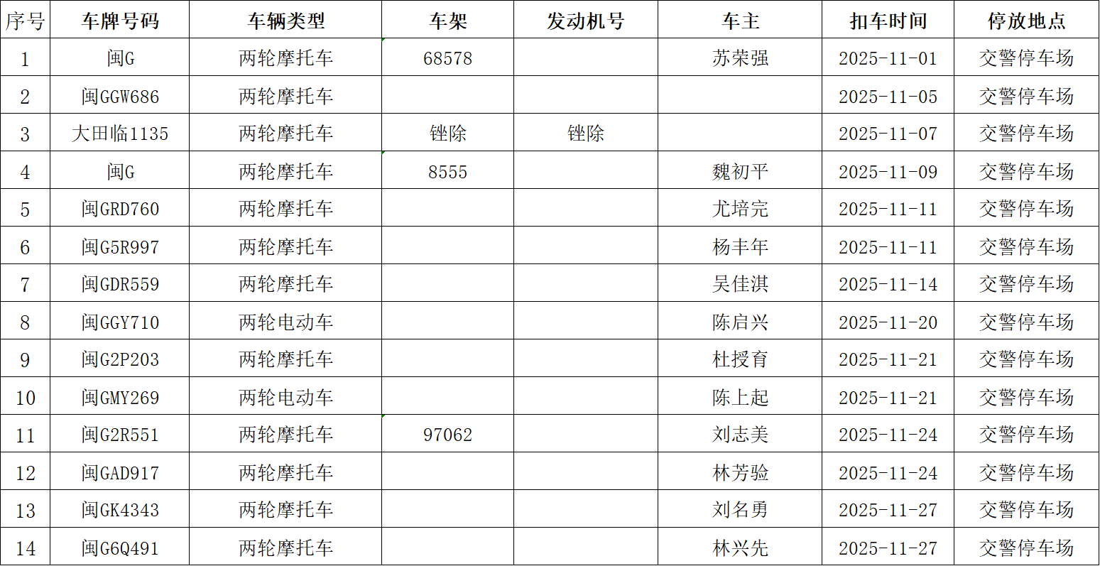 根据《中华人民共和国道路交通安全法》第一百一十二条第三款和《中华人民共和国道路交通安全法实施条例》第一百零七条之规定,现将大田县公安局交通管理大队依法扣留的逾期不来接受处理的下列车辆进行公告。请机动车驾驶人或者车辆所有人、管理人见公告后及时前来接受处理。经公告三个月仍不前来接受处理的,我队将对扣留车辆依法进行处理。